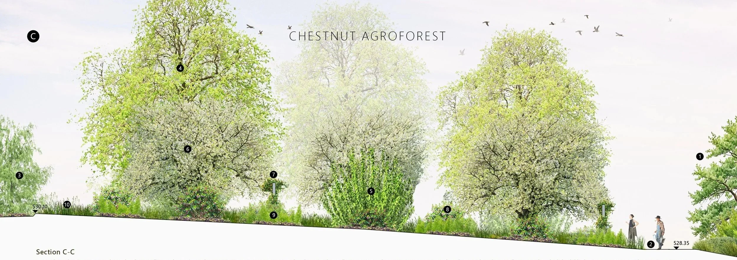 To the south, the Chestnut Agroforest occupies a fertile ridge with loam soils rich in organic matter, following a keyline geometry informed by the traditional chestnut agroforests of central Portugal, know as Castanhais. Rows are aligned with the landform to optimise hydrology and solar exposure, supported by swales that redistribute seasonal moisture downslope to the centre of the ridge. The agroforest includes a polyculture of native fruit trees, blueberries, asparagus and strawberry beds, and annual vegetable beds, organize along the rows in a staggered repeating formation. A ‘living wildflower path’ occupies the alleys, which maintain accessibility, encourage biodiversity, and improve nutrient cycling.