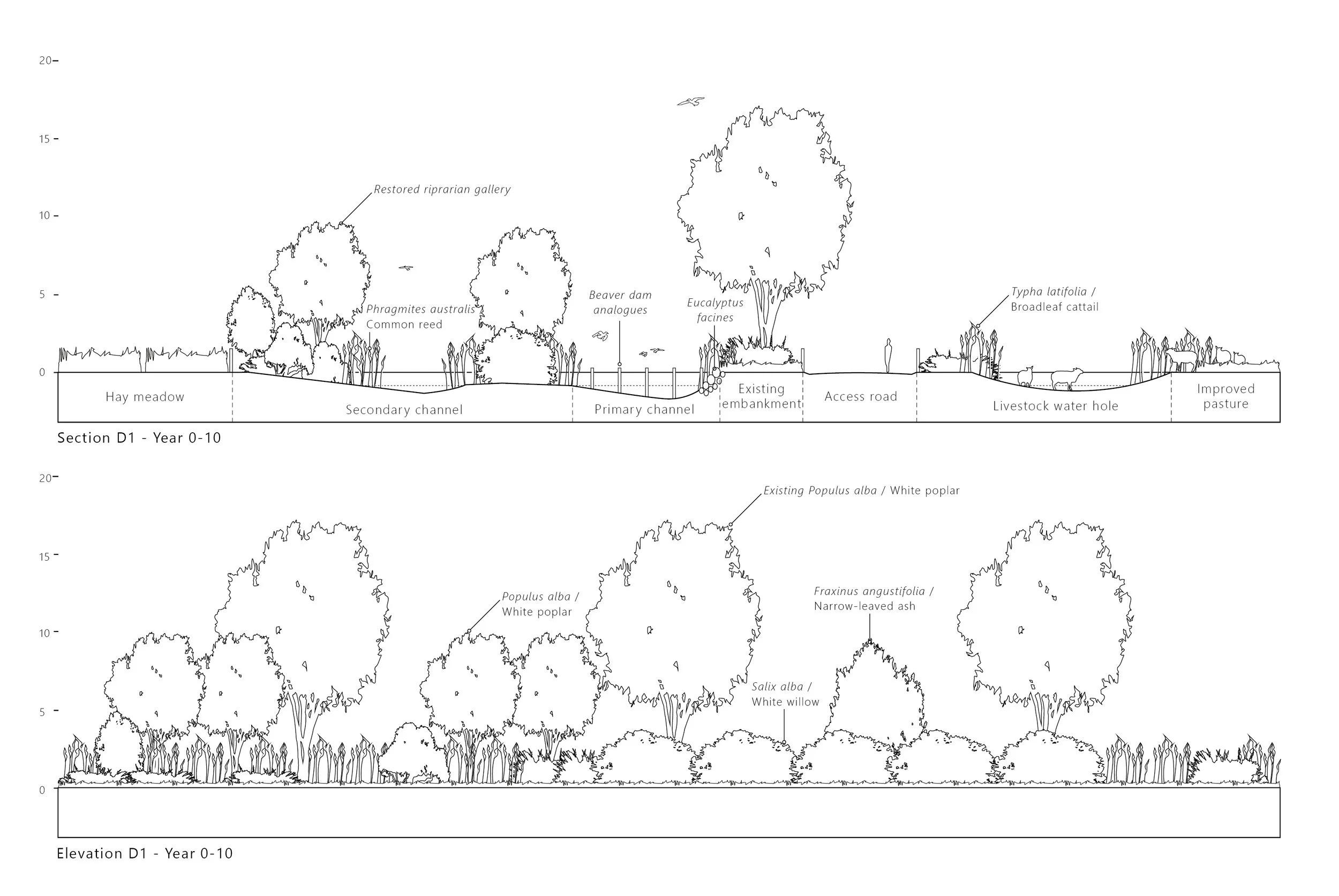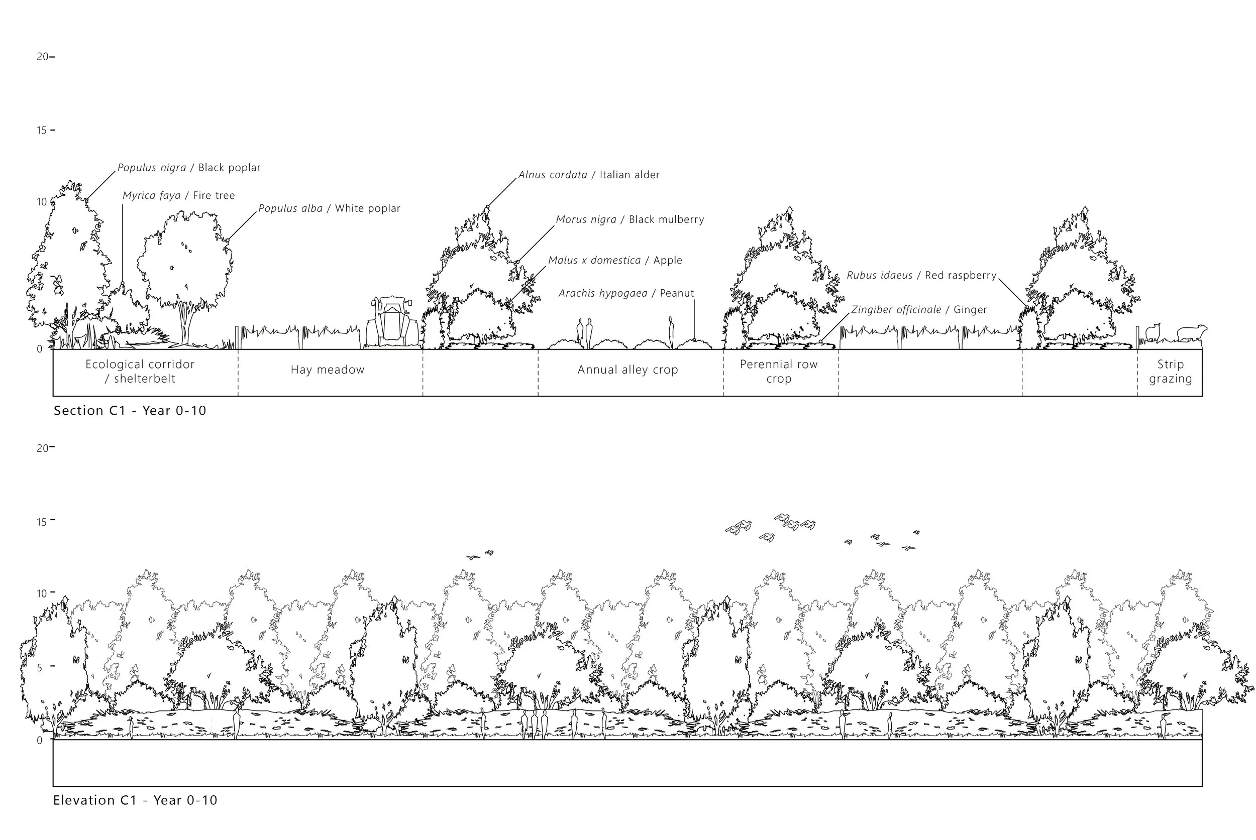 The design response placed significant emphasis on ‘edge conditions’. Each unique edge to the farmland would produce its own distinct agroforestry system. To the north, along the lagoon edge a salt tolerant system was developed, intercropping high quality native perennial halophyte vegetables with mango, sea buckthorn and sumac for fruit and black cherry for timber production. All species are highly salt tolerant and have the capacity to resist saline incursion due to future sea level rise. Running through the center of the site, acting as the anchor for each system is a restored temporary Mediterranean watercourse. Eucalyptus facines and beaver dam analogues help reconnect the stream bed with the surrounding floodplain whilst restored white willow riparian galleries and narrow-leaved ash and white poplar floodplain terraces stabilize the banks and produce dense root-mats for denitrifying bacteria to filter the ground water as it percolates into the lagoon. Either side of the watercourse are large areas of silvo-pasture, predominantly black mulberry, used as a dry season fodder bank for ruminant livestock under rotational grazing. Along the rising valley sides, under xeric conditions, a woody perennial fruit system is proposed, focused primarily on the Portuguese crowberry.