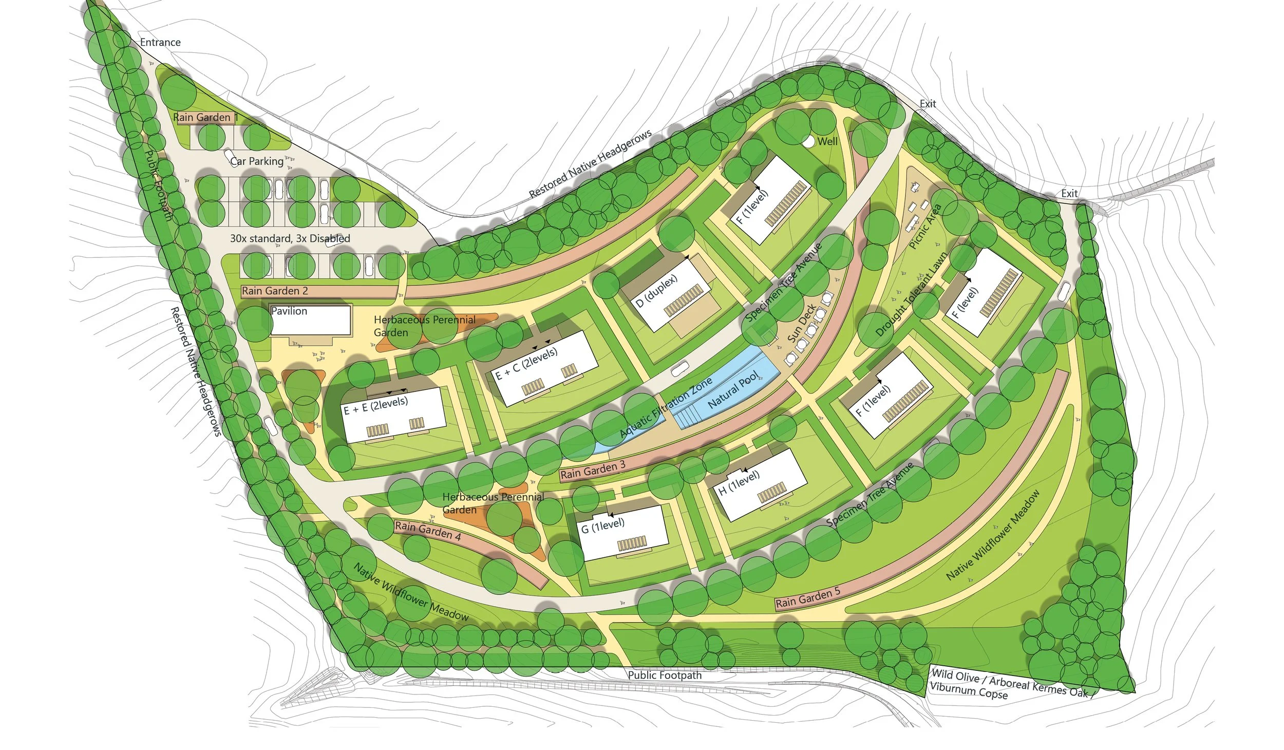 Within the site the landscape was structured around five rain gardens running along contour. These interventions act as the backbone to the landscape, mitigating flooding issues and soil saturation common with the sites heavy clay soils. The rain gardens slow surface run-off, helping increase soil moisture into the summer drought, whilst recharging the aquifer below. Eight urban units and a pavilion are positioned within this system, taking advantage of breaks in the hedgerows, responding to specific panoramas of the Atlantic ocean and the Sintra hills beyond. Extensive wildflower meadows are proposed to act as the connective tissue between all the individual components within the landscape. Managed as conservation hay meadows for high species richness, the meadow species compositions is based on the specific potential natural vegetation of the seasonal alkaline meadows of central-west Portugal.