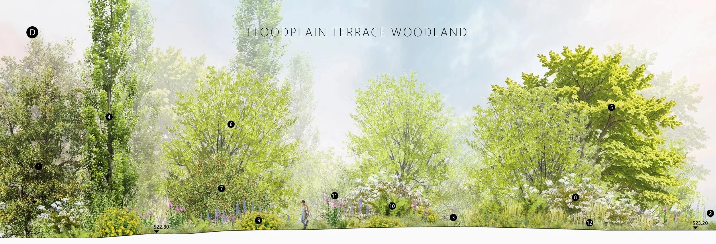 At its northern edge, the Riparian Tall-Herb Meadow forms a sheltered gathering space around the fire pit area, maintaining open views towards the 2000m high snowcapped peak of Torre. The planting here represents the megaforbic woodland edge community associated with the alder gallery, displaying showy herbaceous perennials exceeding two meters in height, with a strong late summer phenology. The tall scenessed meadow biomass would be retained through autumn and early winter, providing a striking frost covered seasonal character to the space, whilst offering seed forage to local fauna until a mid-winter cut back.