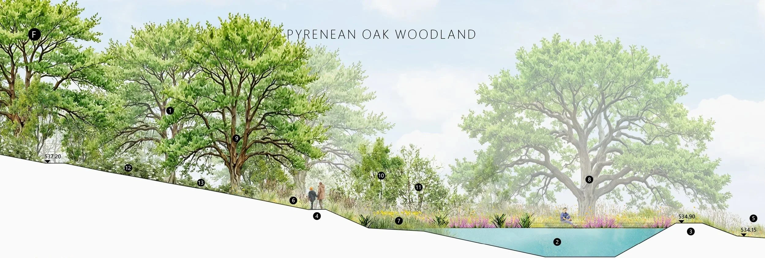 Along the western flank of the property, and further upslope to the south, the proposal aims to re-establish a Pyrenean Oak Woodland, a historically coppiced deciduous–marcescent forest that once formed the regional climax community, traditionally maintained as a charcoal producing agroforestry system know as Touças. This woodland enhances biodiversity, provides privacy, and forms a natural fire buffer, while supporting the reintroduction of the vulnerable tree Sorbus latifolia.