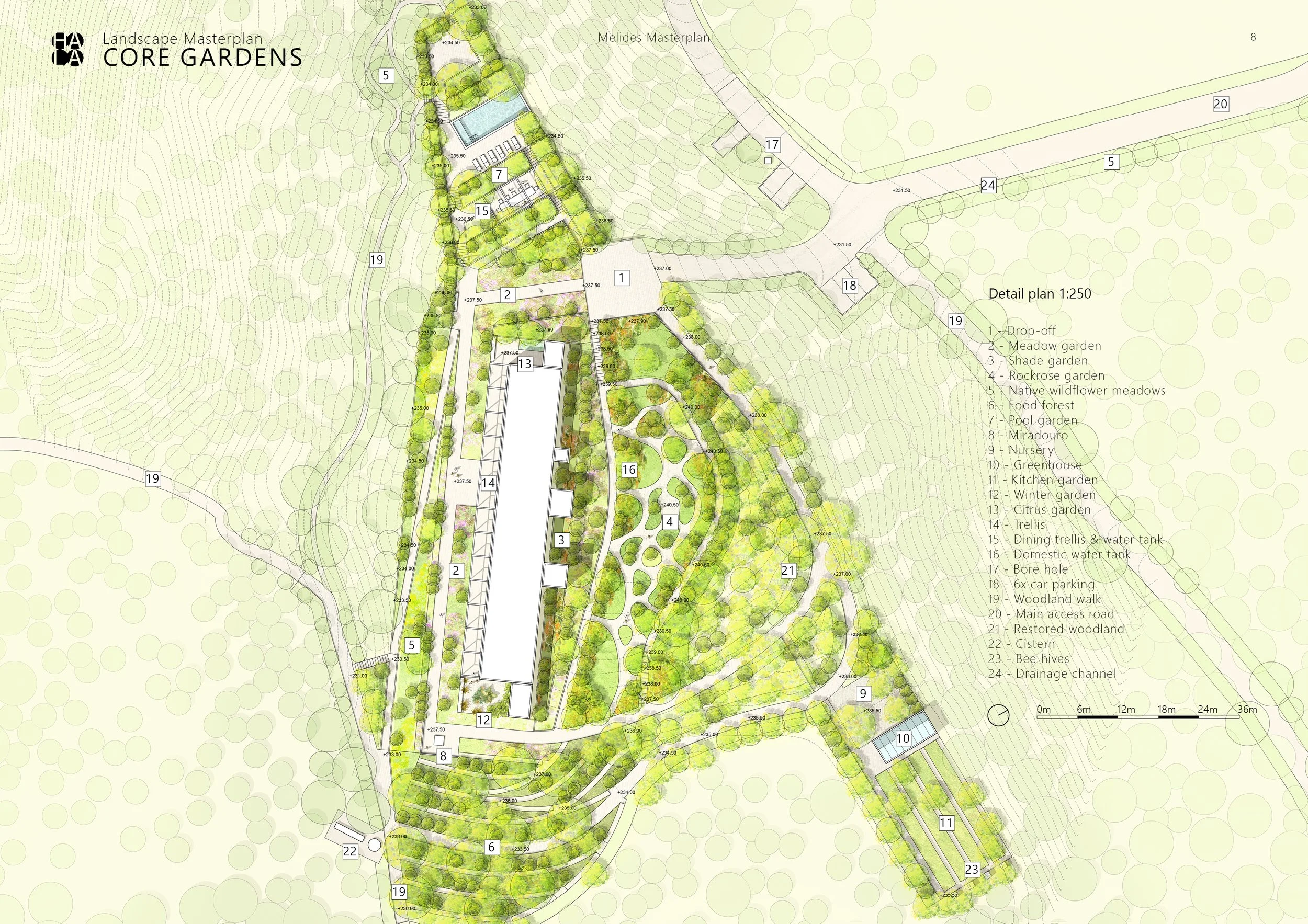 HA Landscapes was invited by the client to develop a Landscape Masterplan for a hotel and residence within a 10 hectare property in the hills of Grandola, located along the Atlantic coast in south-west Portugal. The concept for phase 1 of the landscape design was borne out of an interpretation of the potential natural vegetation of the surrounding cork oak and narrow-leaved mock privet forest sigmetum. Due to the sites topography along a high ridge, the proposed gardens surrounding the hotel occupy independent plains within the landscape, responding to gradients in soil moisture and soil depth across the space.